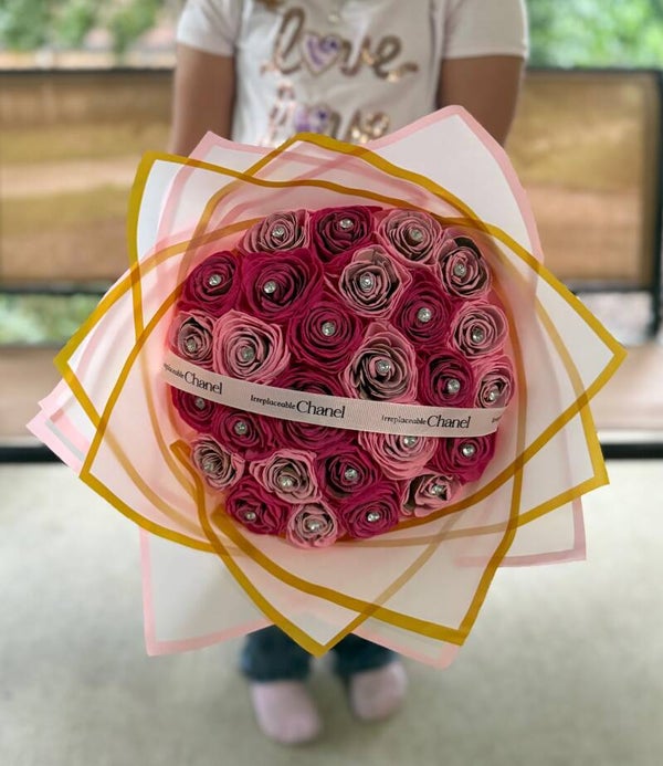 So your princess can sparkle every day with our 28 rose bouquet in two shades of pink with rhinestone centers. Chose your ribbon.